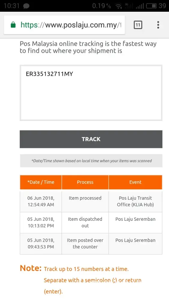 Pada 04/06/2018 saya telah mendapat tracking no untuk barangan online yang saya beli dari seller.