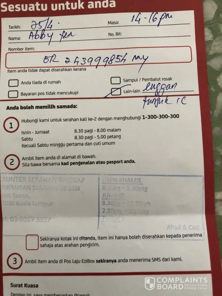 Saya terima notis pos laju pada hari ini. Saya cuba call customer line 1300 300 300 untuk membuat penyerahan kali kedua. Malangnya, masa & duit saya terbuang begitu sahaja. Seolah2 talian tu memang sekadar hiasan sahaja. Tiada operator yang menjawab & kena dengar iklan2 yang bising berjam2 lamanya. Setiap kali telefon kata tunggu 15 minit lagi. Telefon semula kena tunggu lagi. Sampai bila? Kredit dah macam air buang ke iklan yang takde kena mengena tu! Macam mana lagi saya nak mintak pihak pos laju buat penyerahan kali kedua? Ini item no saya: FQ002105701MY. Tolong la jangan nak aniaya orang.
