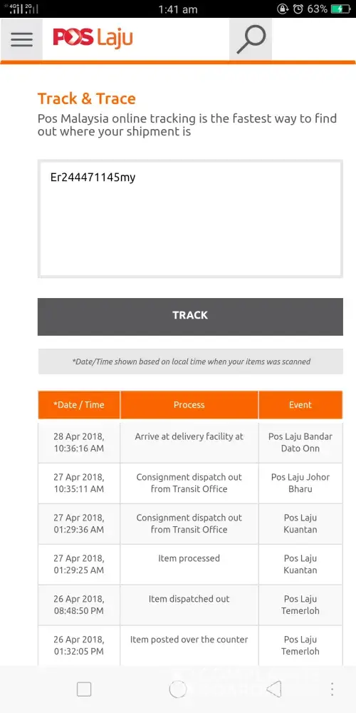 28/4/18 dah sampai pos laju bandar dato onn jb..sampai sekarang 6/5/18 check tracking still sama lagi.. Apa masalah pos laju sekarang ni sebenarnya ya..? Agak2 lah..jgn buat pelanggan tertunggu2 .ataupun nak tukar nama jadi pos lambat pulak.? Tolong ye perbaiki mutu perkhidmatan anda wahai pos laju..please double check dan hantar brg saya secepat mungkin.