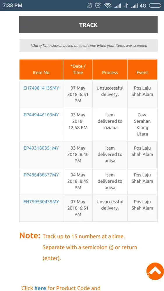 Sye tidak faham kenapa sejak kebelakangan ini pos laju cawangan muar lmbt proses penghantaran barang..sye adakalanya trpksa menunggu hampir 10 hari dan no tracking setiap hari cuma mengatakan item out for delivery tapi barang masih tidak sampai..sudah lh service kne bayar mahal tp service hancur..update pada web tp barang masih diperam di pejabat pos..jika barang yg di post tu ubatan kecemasan bagaimana?