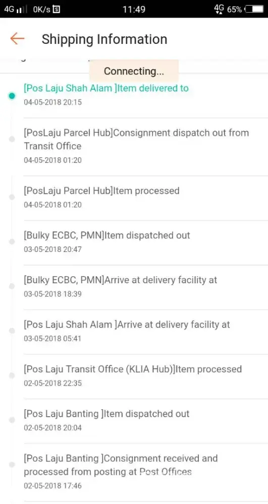 Barang sya pos pada 3/5/2018. 4/5 sampai sekarang 8/5 barang tu still tersangkut dekat Poslaju Parcel Hub. Come on lah pos laju, sya nak guna urgent barang tu. Sepatutnya bukan dalam masa 3-5 hari dah sampai ke. Barang tu di pos di KL, sya duduk di Johor. Kalau nak diikutkan tak jauh pun. Geram betul dengan pos laju ni. Tracking no sya : EH811262826MY.