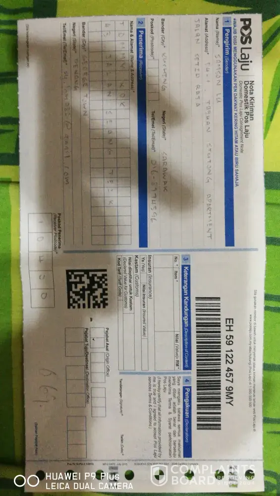 Pada 3.10.2017, saudara mohd. Redhuan che salleh beralamat di kpg pasir gajah pengkalan chepa kota bharu kelantan telah menghantar bungkusan pos laju kepada saya Jubni bin sulong beralamat di lot 6220, lorong 4C fasa 2 tg bundong kota samarahan sarawak dengan menggunakan perkhidmatan pos laju betalamat di pengkalan chepa kota bharu kelantan namun sehingga kini barangan tersebut tidak dapat dikesan.