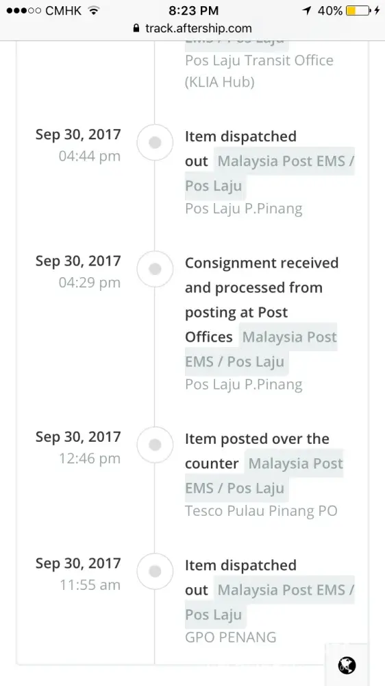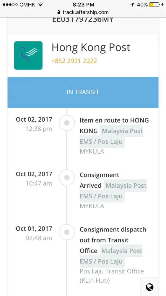 My aunt have sent me some moo cakes from Malaysia to Hong Kong on 29/9. The postman told her that the parcel will be able to reach in 4 days. However, I have not received anything until 6/10. I have tried to trace online and it was stated that the parcel is in transit since 2/10 and there is no update at all after that! It is absolutely disappointing and ridiculous that the delivery is late for more than 1 week!