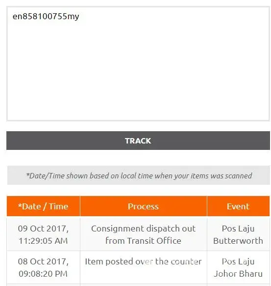 System showing my parcel sent out form JB on 08 Oct 2017, and reached Butterworth and sending out from butterwoth brach on 09 Oct 2017 11.29am.