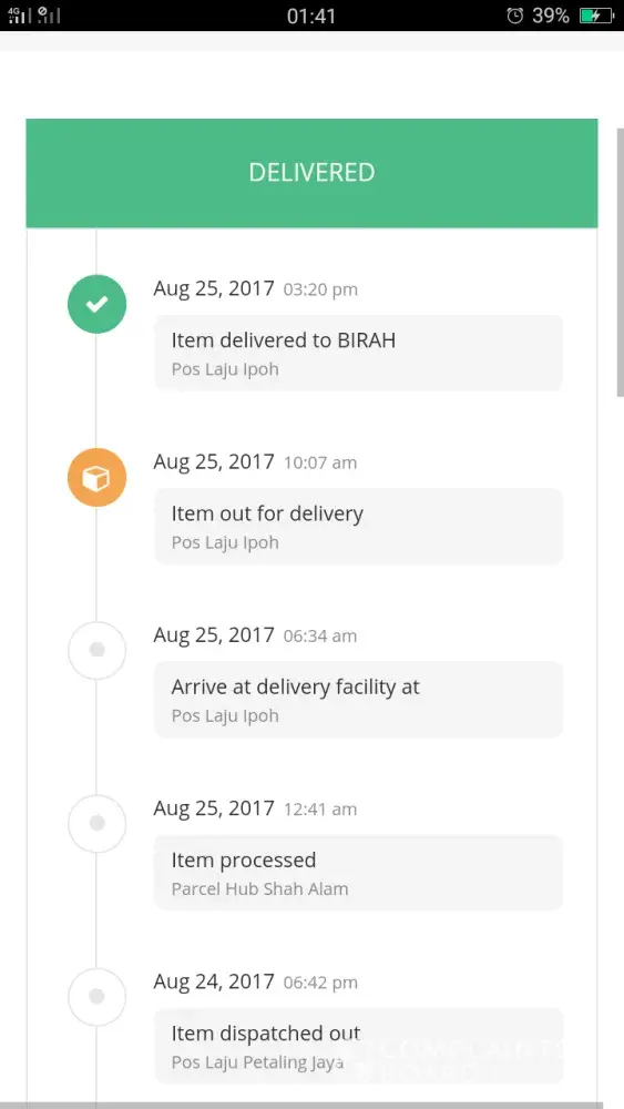 Parcel sepatutnya sampai(dispatched out) pada 11/9/2017 tetapi parcel tersebut terlewat sehari dan sampai kepada saya pada 12/9/2017. Saya telah menghubungi pihak pejabat pos serahan cawangan Jelutong, Pulau Pinang pada 11/9/2017 dan mereka memberitahu parcel tersebut telah diedarkan ke pejabat pos Jalan China st., Pulau Pinang dan sedia untuk dihantar tetapi parcel sampai pada 12/9/2017 . Namun, apa sangat mengecewakan parcel yang sampai dalam keadaan yang tidak baik (terkoyak) serta barang didalam parcel jugak turut terkoyak.