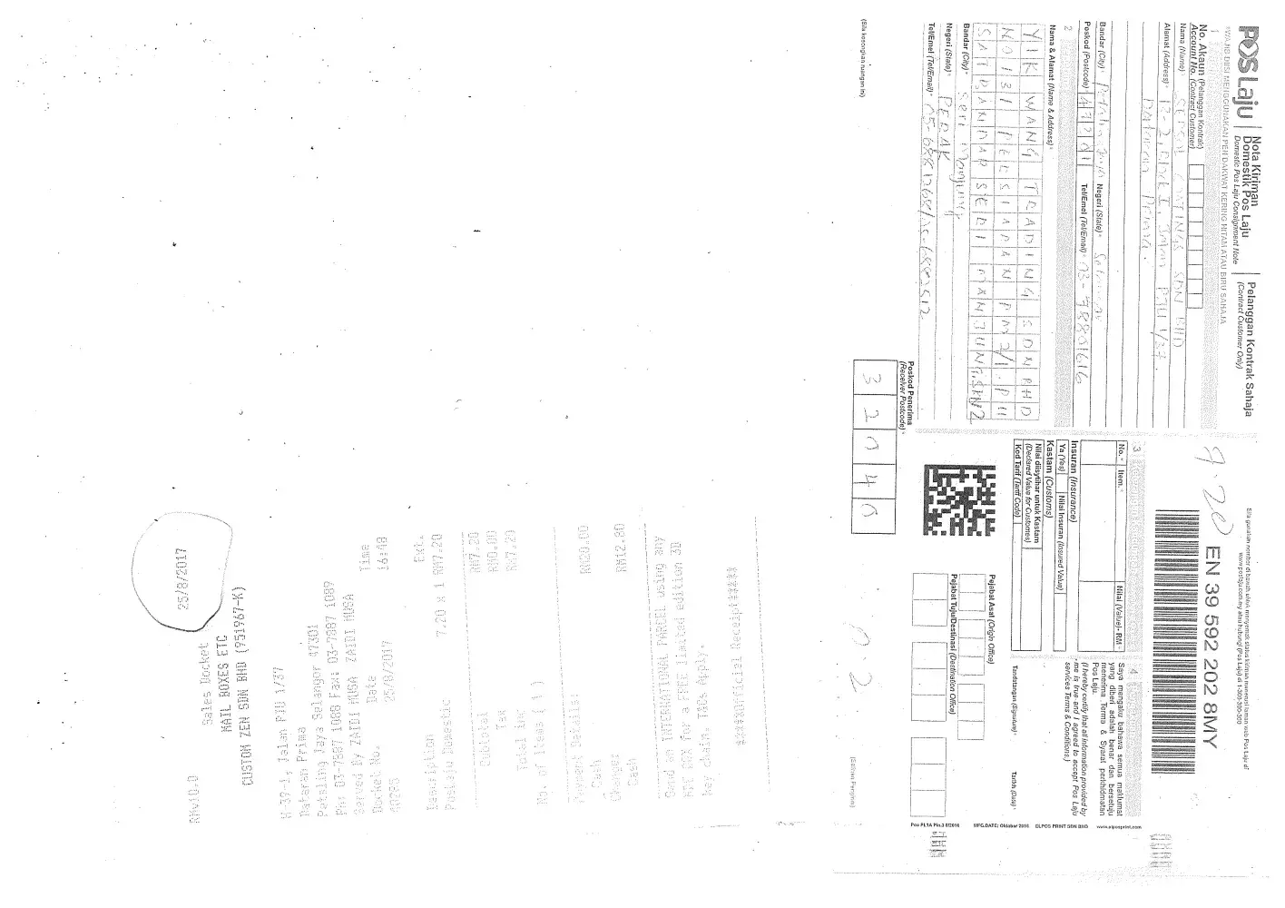Pada 25. Aug. 2017, kami menghantar dokumen ke Mail Boxes ETC Custom Zen SDN BHD jam 16.48 dan sepatutnya dokumen akan di pungut oleh pegawai pejabat pos pada 26. Aug. 2017 sebelum jam 12 tengahari.