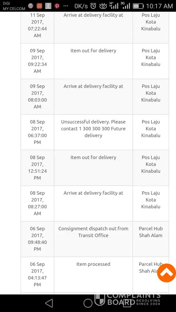 Sehari saya tunggu di rumah tapi barang tak sampai2. Saya dah call kat poslaju Cheras banyak kali tapi tiada orang jawab. Saya call [protected] dan diberitahu parcel saya tak sempat hantar hari ini dan akan di hantar semula pada isnin depan 3/9/17.