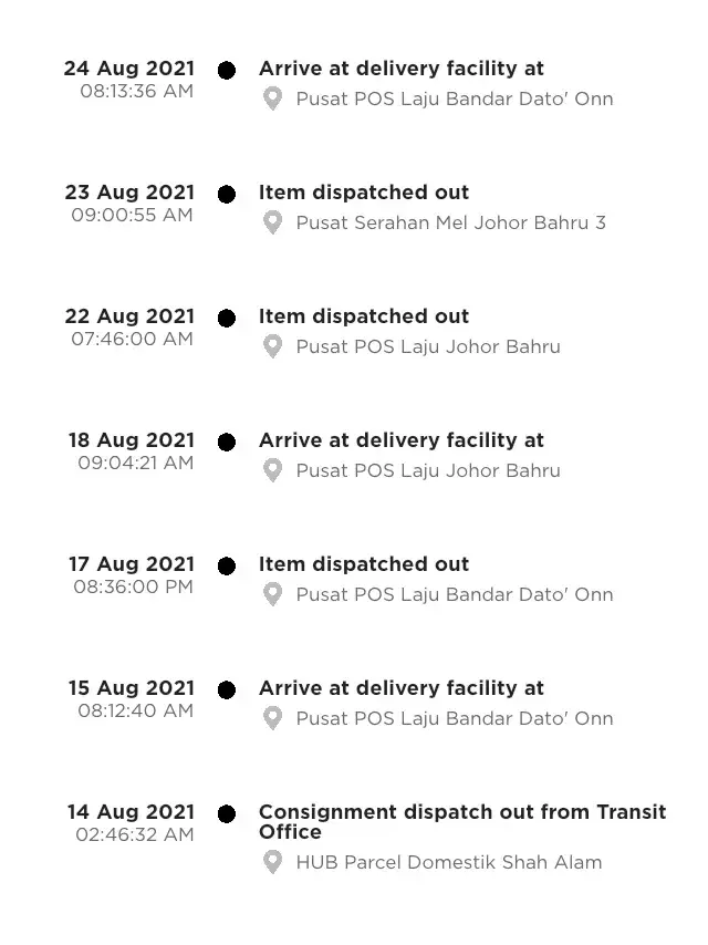 The parcel was posted on 13/8 but untill now i have not received anything. Then it arrived at poslaju dato onn, dispatched out to pislaju johor bahru, from there it went to pusat serahan mel JB, next went back to poslaju dato onn, and then it was dispatched out to poslaju jb, and then again returned to dato onn and when i check yesterday it was dispatched out to poslaju jb again in a never ending loop