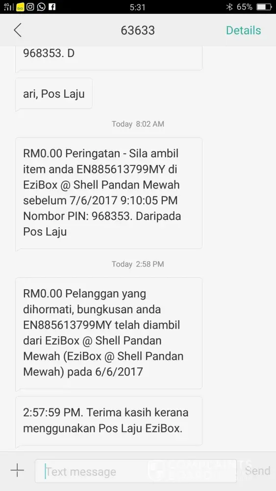 saya tlh dihubungi oleh poslaju utk mengambil parcel saya di ezibox pandan mewah pada 5/6/17. Dan pada hari ini jam 230petang saya telah ke ezibox dan cuba utk mendapatkan parcel saya. Saya telah mengikut semua arahan dan memasukkan no pin dan no parcel dgn betul. Dan saya jgk telah memohon utk print resit. Beberapa minit selepas itu sy mendapat msg mengatakan brg tlh diambil tetapi pintu loker tidak terbuka dan resit jugak tidak dikeluarkan. Saya tlh menghubungi talian bebas tol poslaju dan tlh membuat komplen. Tetapi tiada sesiapa dr pihak poslaju yg menghubungi saya utk menerangkan atau menyelesaikan masalah saya ini.. Saya amat kecewa.