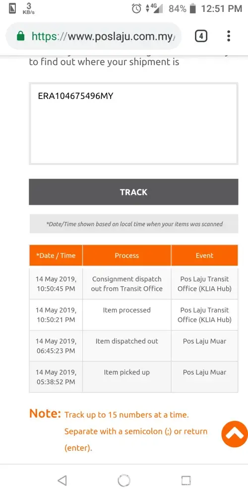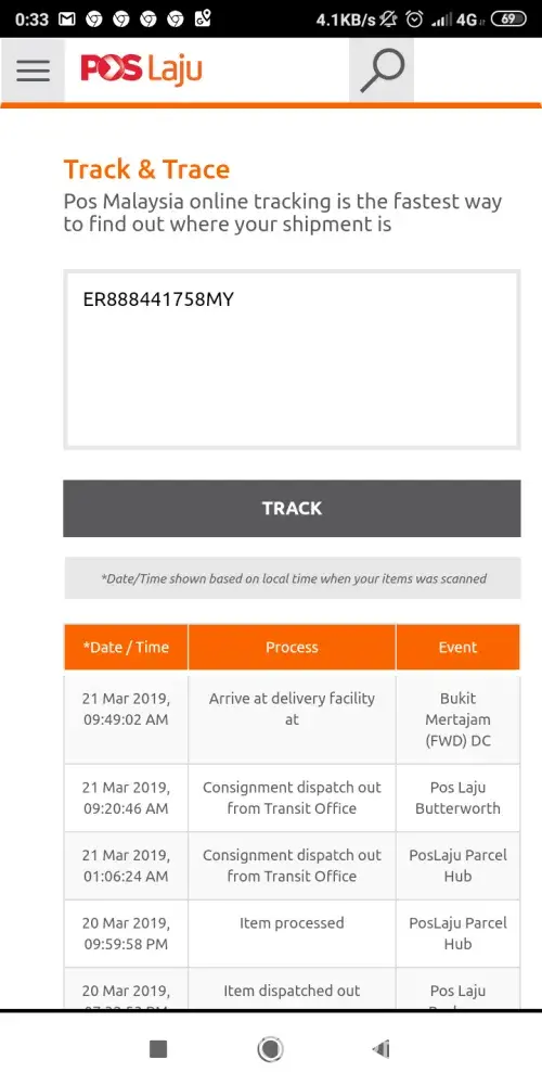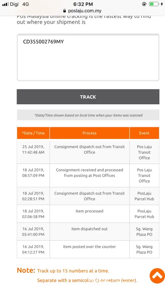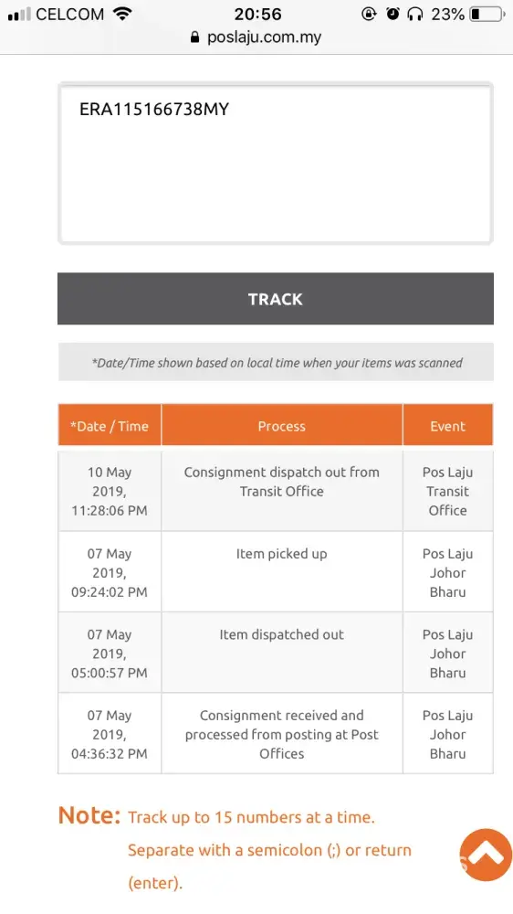 Saya datang ke pejabat pos laju untk ambil barang saya. Meringan kan kerja pengeposan encik2 van. Tapi encik bhgian track brang tak jalankn tugas. Saya smpai ke pjbt dia cakap barang pos dh kluar kan.tapi tak ade pon sampai sedangkan dia malas untk check tracking num. Sy check sndri msih xkluarkan lgi. Sy nak pakai brg tu hrini. Masalah!