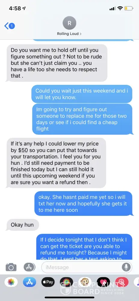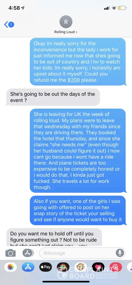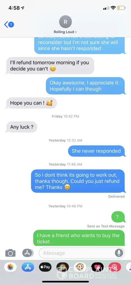 Hi, i understand under the circumstances you cannot refund me the money but I'd like to make you aware of the situation. I recently began to purchase a festival ticket from michi_nf, where i paid half upfront then the other half later. She told me i could have a 100% refund if i could not longer attend the festival. When i unfortunately could no longer attend she then blocked me and refused to give my money back. I no longer can get ahold of her. Since purchasing this was off of poshmark i am not looking to recieve my money back but I do not believe this person should represent your company and selling things online if they are stealing from people. I lost $400 due to this and now have to get a lawyer to get my money back.