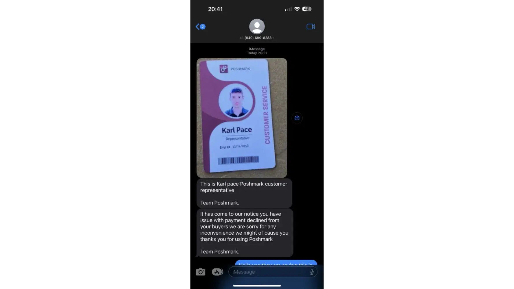 this person even sent an ID of Karle Pace as a Poshmark rep I never sent him the money I emailed Poshmark support then I googled if poshmark has text message support and google showed that poshmark support only emails and it takes 2-3 business days so I think its a scam please be advised!