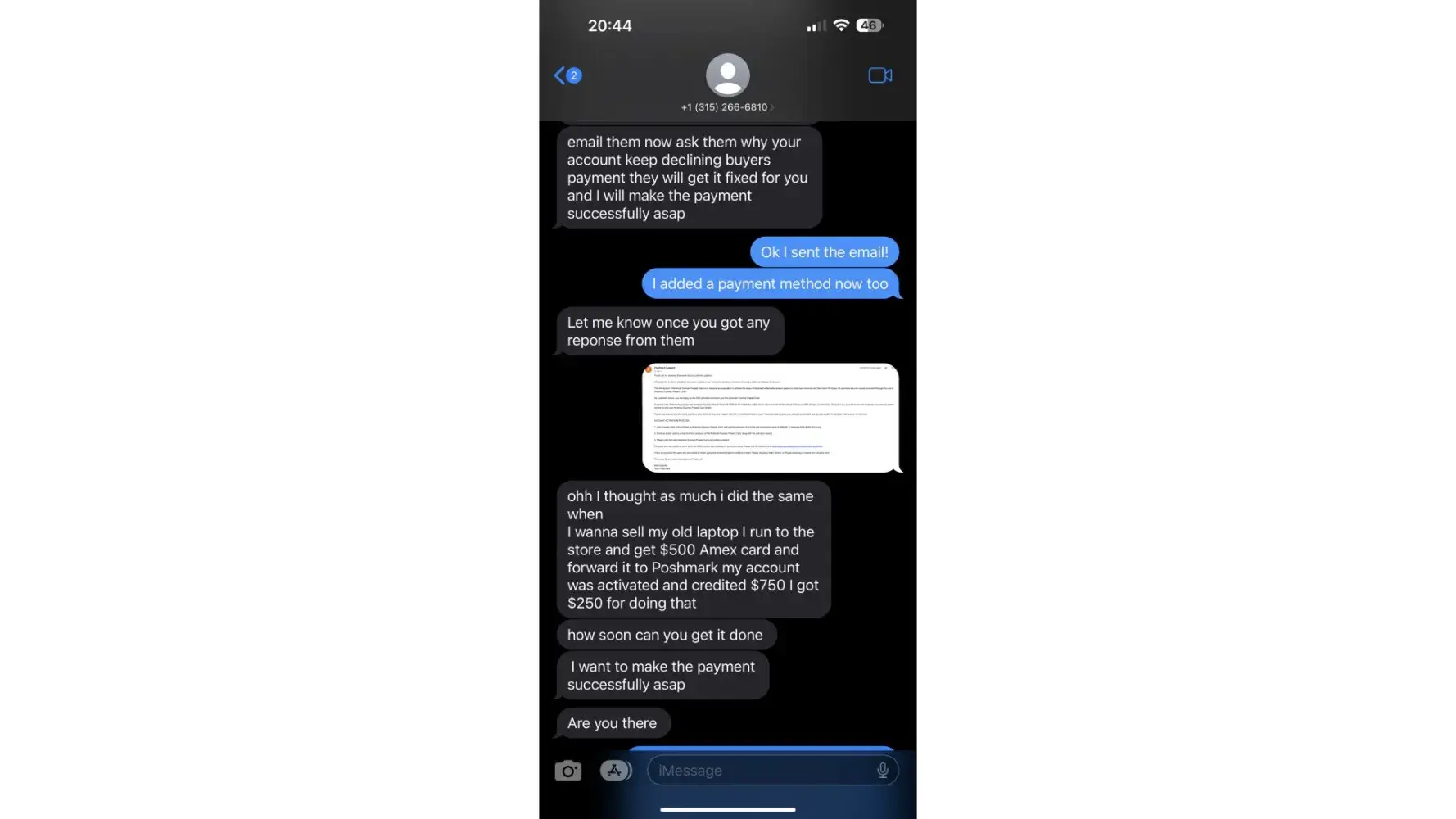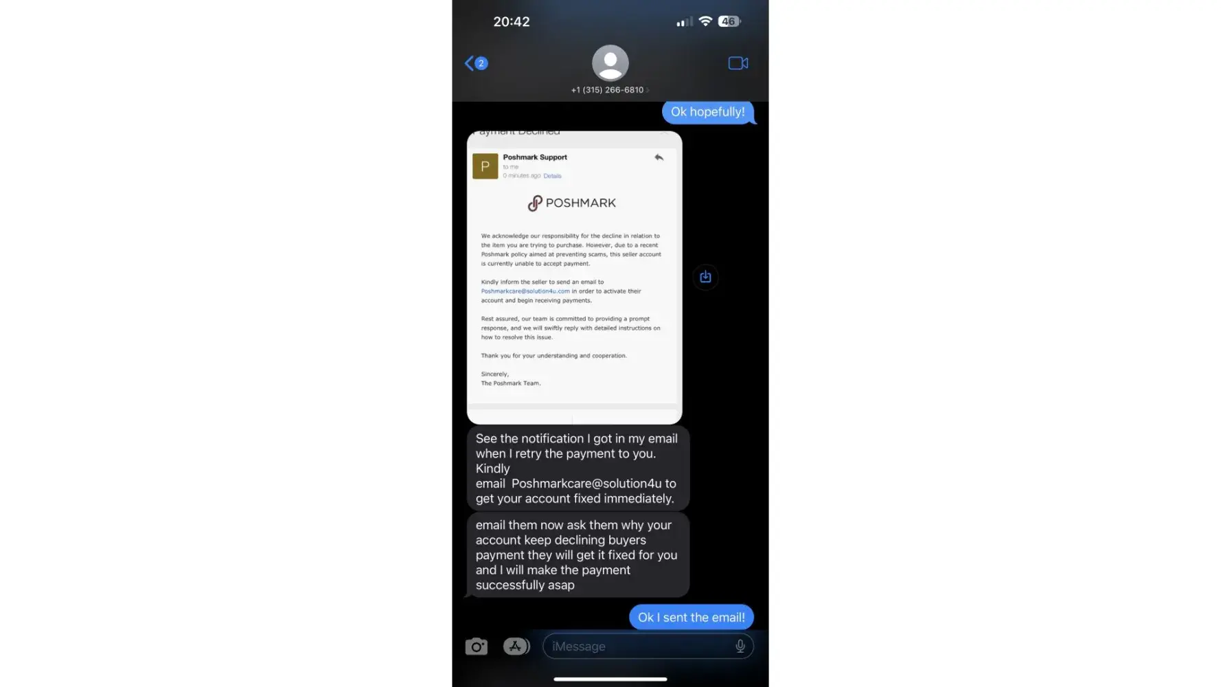 I believe I am being scammed on posmark. I was sent an email with a phone number on it, for a specialist to specifically fix my posh page. The Number is [protected].