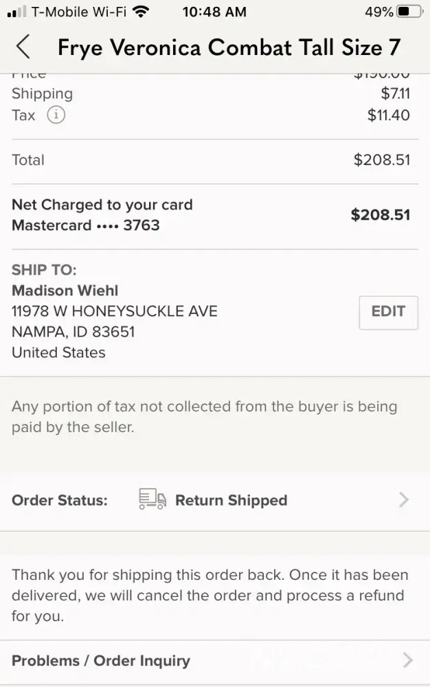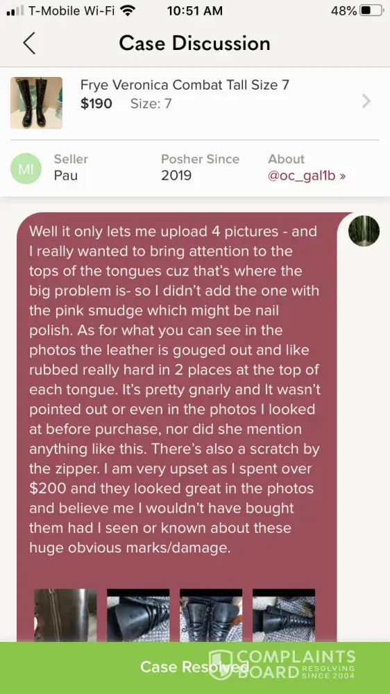 I purchased a pair of boots around October 5, 2020 when I receive them there was damage that was not disclosed. I filed a complaint and was awarded that once I shipped back the item I would be given my money back. On October 13th the damaged boots were sent back, but I still haven't received a refund. When I write Poshmark support they don't even acknowledge the situation. As if they didn't even read my third email now. I am getting so upset as it was over $200 and I am a single mom who was just trying to treat myself but now I'm getting completely screwed over. I have pictures of everything too. Which I'm glad I took cuz suddenly my ‘case history' has disappeared. As you can see in some of the photos I'm attaching, they don't even mention my refund.