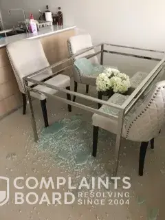 To our horror, we returned home on Saturday 16 Sept 2017 (after a week away) to find the glass top seemingly imploding and glass pieces shattered all around our dining floor. Attached are pictures of this nightmare scene. We had assumed given the good name Pottery Barn has in the US, the dining table will be able to cope perfectly well with NORMAL home life? So we were absolutely flabbergasted when we greeted with our shattered dining table. The only silver lining in this incident is that our pet dog was not underneath it when it broke, nor were we having a meal on it with our feet beneath. If these had been the case, it is scary to think what injuries it would have caused to our dog or us.