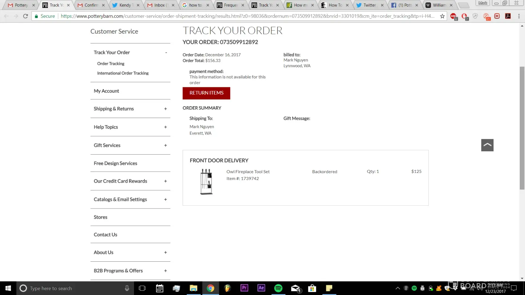 12/16/2017 Ordered Owl Fireplace Tool Set which was Backordered but promised to be out for delivery on the 20th. Also PAID for one day shipping, so expected on 12/21/2017