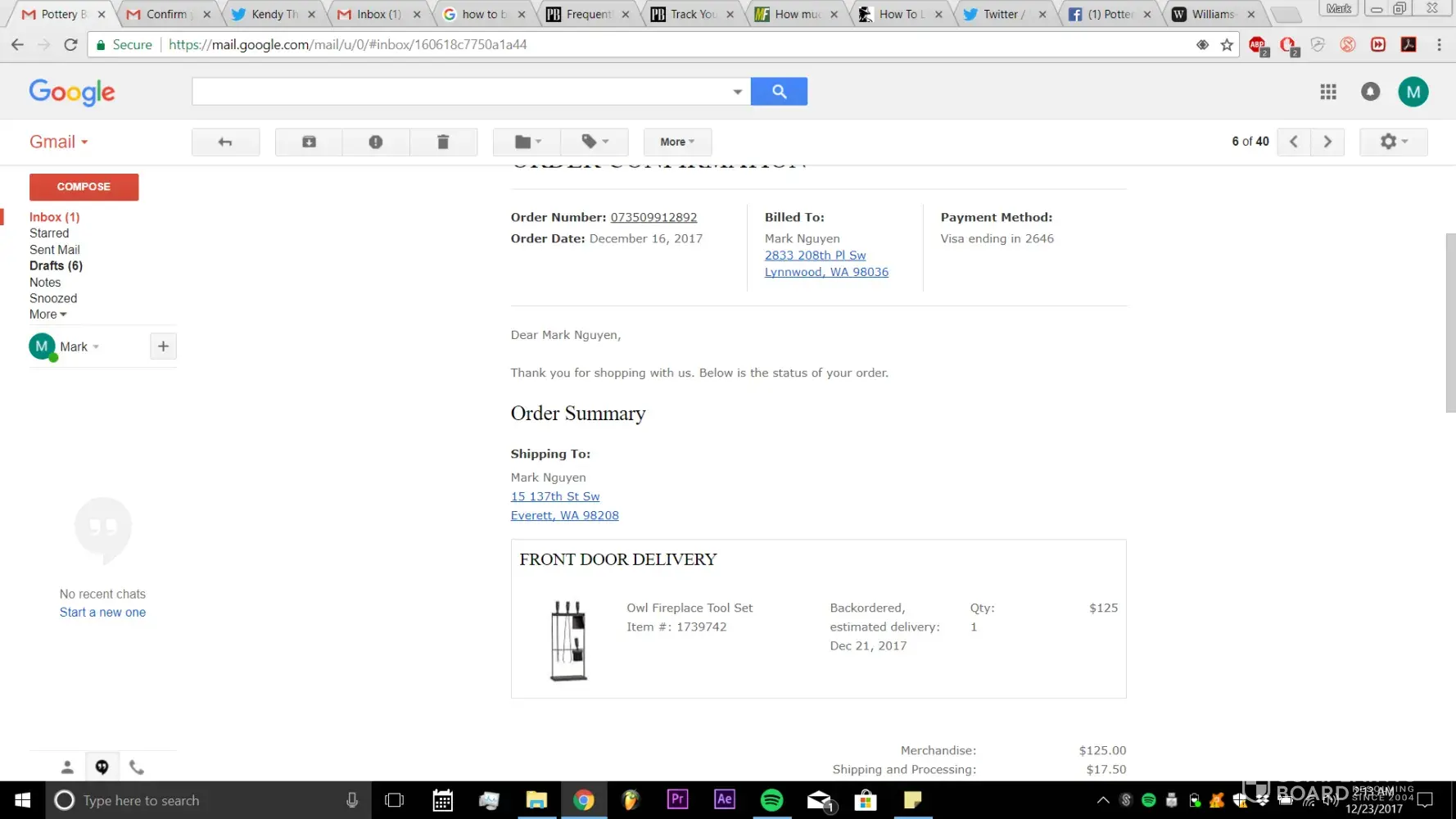 On 11/28 I ordered a whole new bedding onsomble from Potterybarn online,