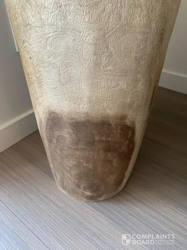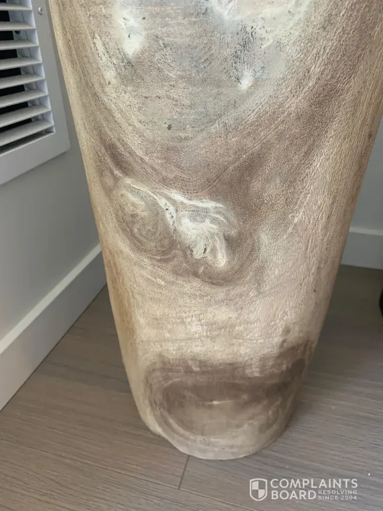 I placed an order for this vase on 6/25/21 which arrived on 7/7/21. Upon opening the product, a strong scent of cigarettes escaped the box. Inside I found an item that looked nothing like the vase that was advertised. The outside was never white washed (as was advertised), it was full of dark stains and burn marks, and was clearly an unfinished product that they forgot to paint in the warehouse. The item is so ugly there is no way the website would include images of it on their customer photo page. The scent was stinking up my apartment that I rent so I threw away the vase as it served no purpose except to damage my apartment. I spoke to two customer service reps on two different days (submitted 7/7, replies 7/8 and 7/9), both of which would not offer anything in return unless I returned the item. I would like a refund immediately -- keep in mind this thing is $200 + tax/shipping ($238).