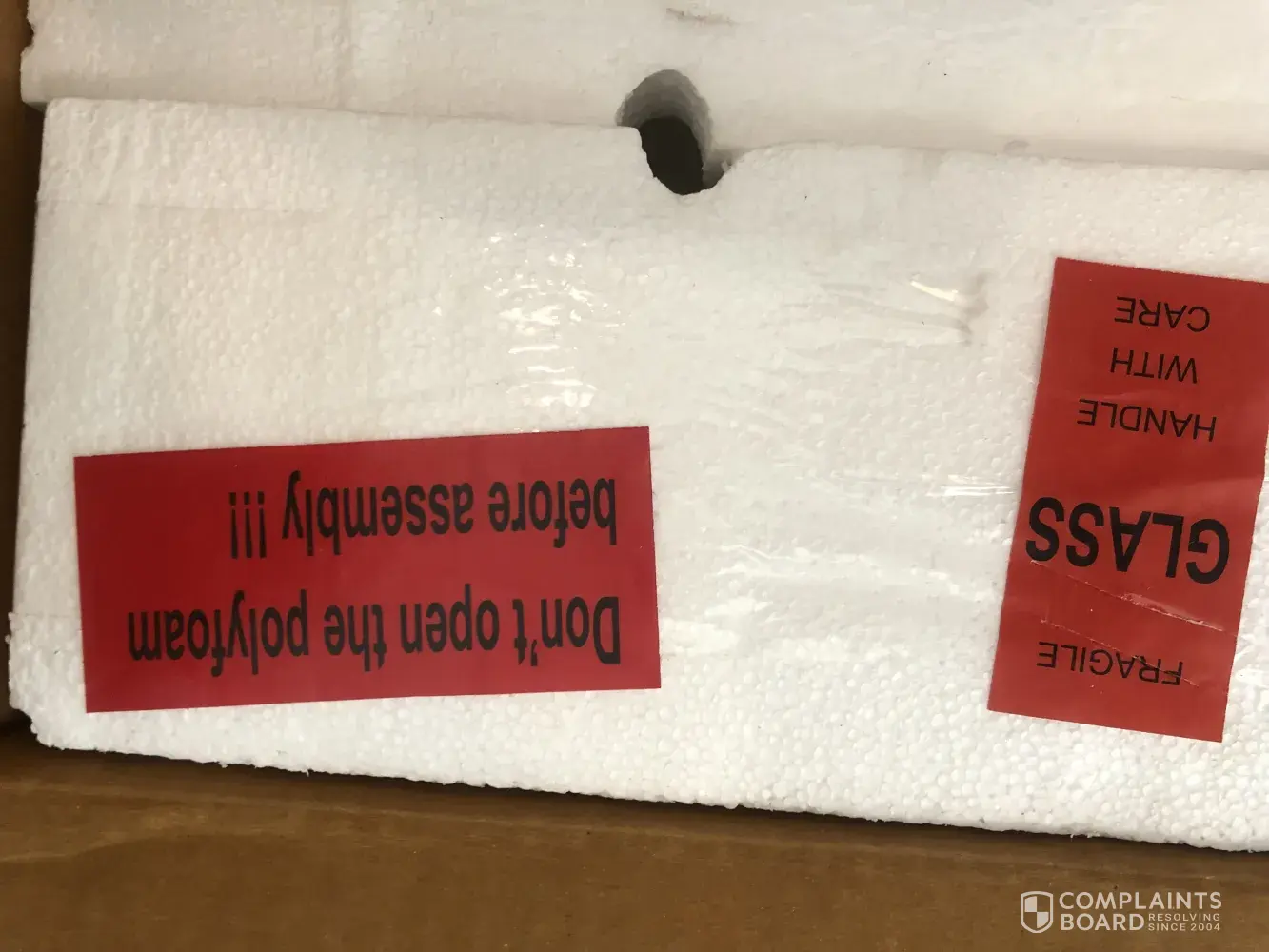 Today, 9/3/2021, a licensed electrician came to our home and installed the fixture. Upon removing the rectangular Styrofoam around each glass pendant, he discovered one was broken. It says specifically on the foam encasement to NOT open until the product has been properly installed, so there was no way for us to realize until now that the item was damaged. (See image showing warning on styrofoam)