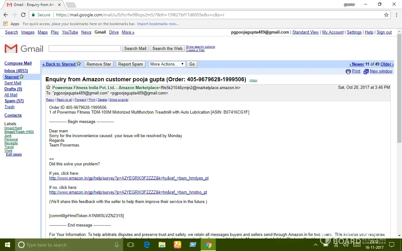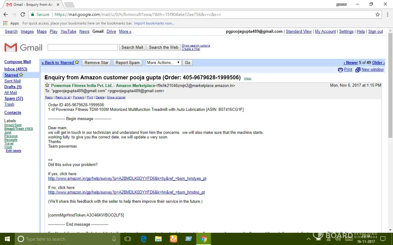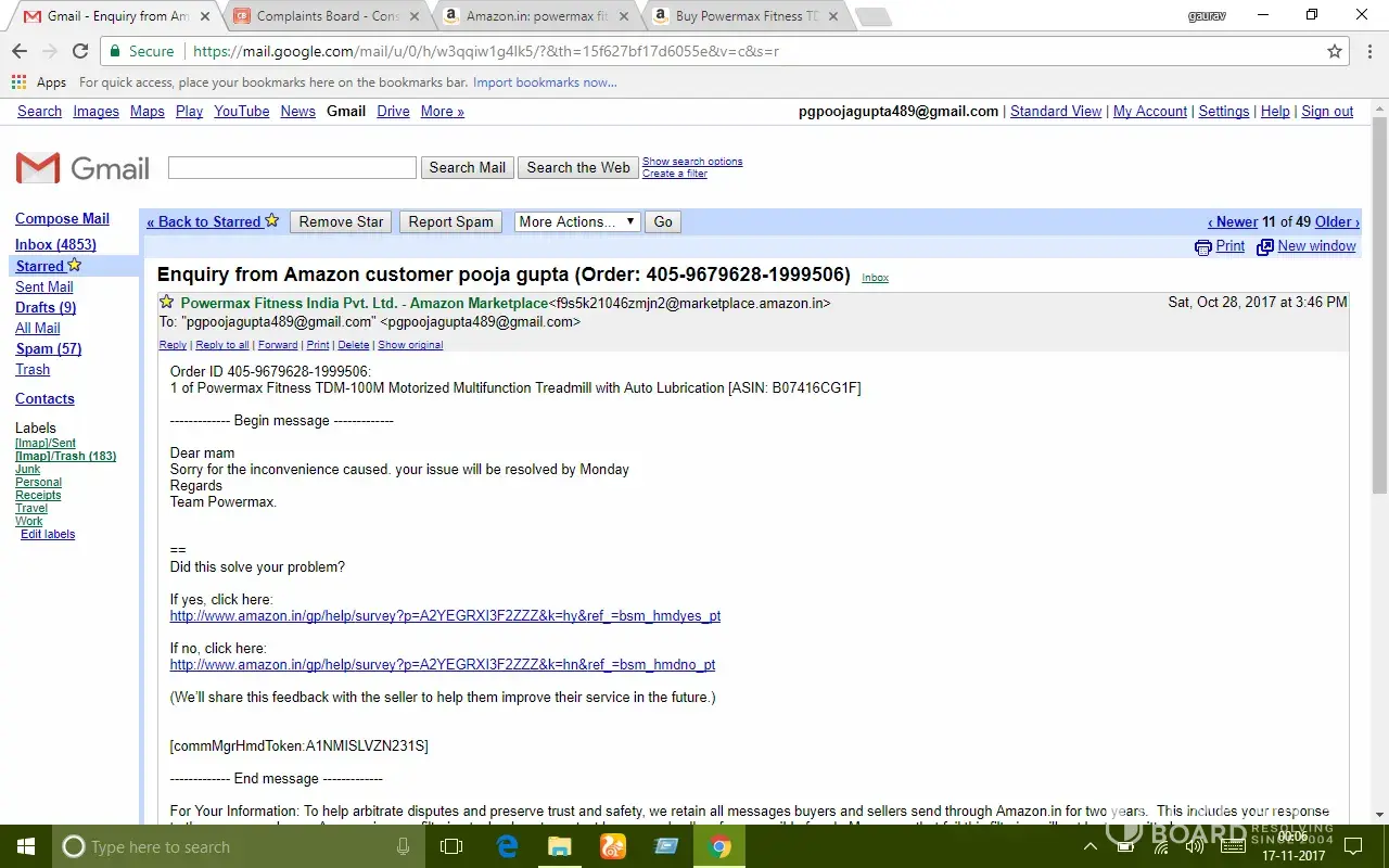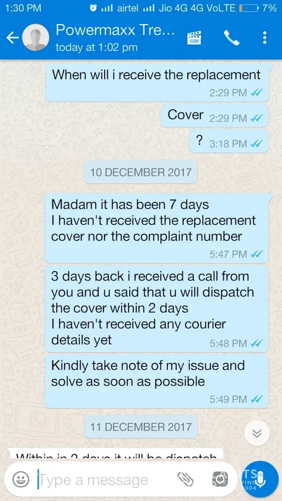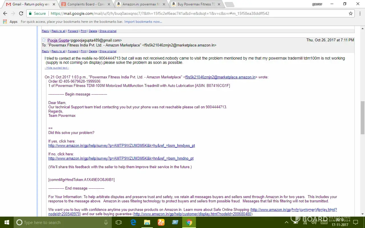 After almost 15 days usage treadmill stopped functioning. I made my first complaint to powermax fitness by phone call on 18/10/17 and called continuously for three days but nobody responded then I made my complaint through amazon and got a response mail by powermax fitness on 21/10/17 assuring to resolve my problem as soon as possible but all I got was their mail promising.. After a long follow up by e-mail and calls they sent a technician on 04/11/17 who was unable to resolve the problem.. Since then nobody visited.