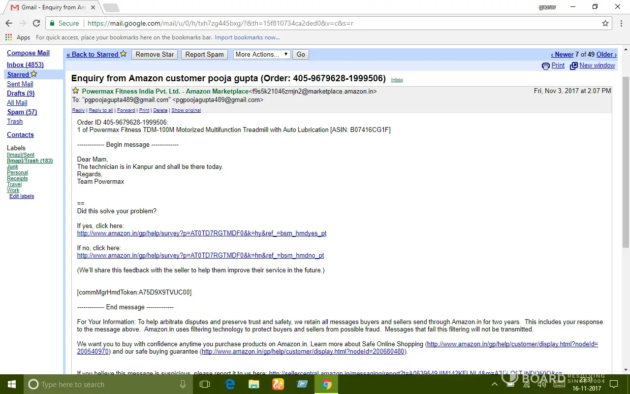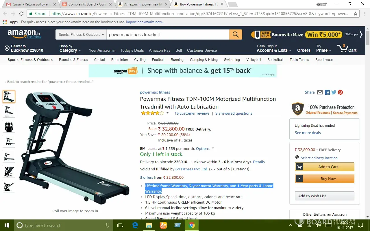 I purchased powermax treadmill model tdm-100m from amazon.in on 22/09/17, product delivered on 28/09/17.