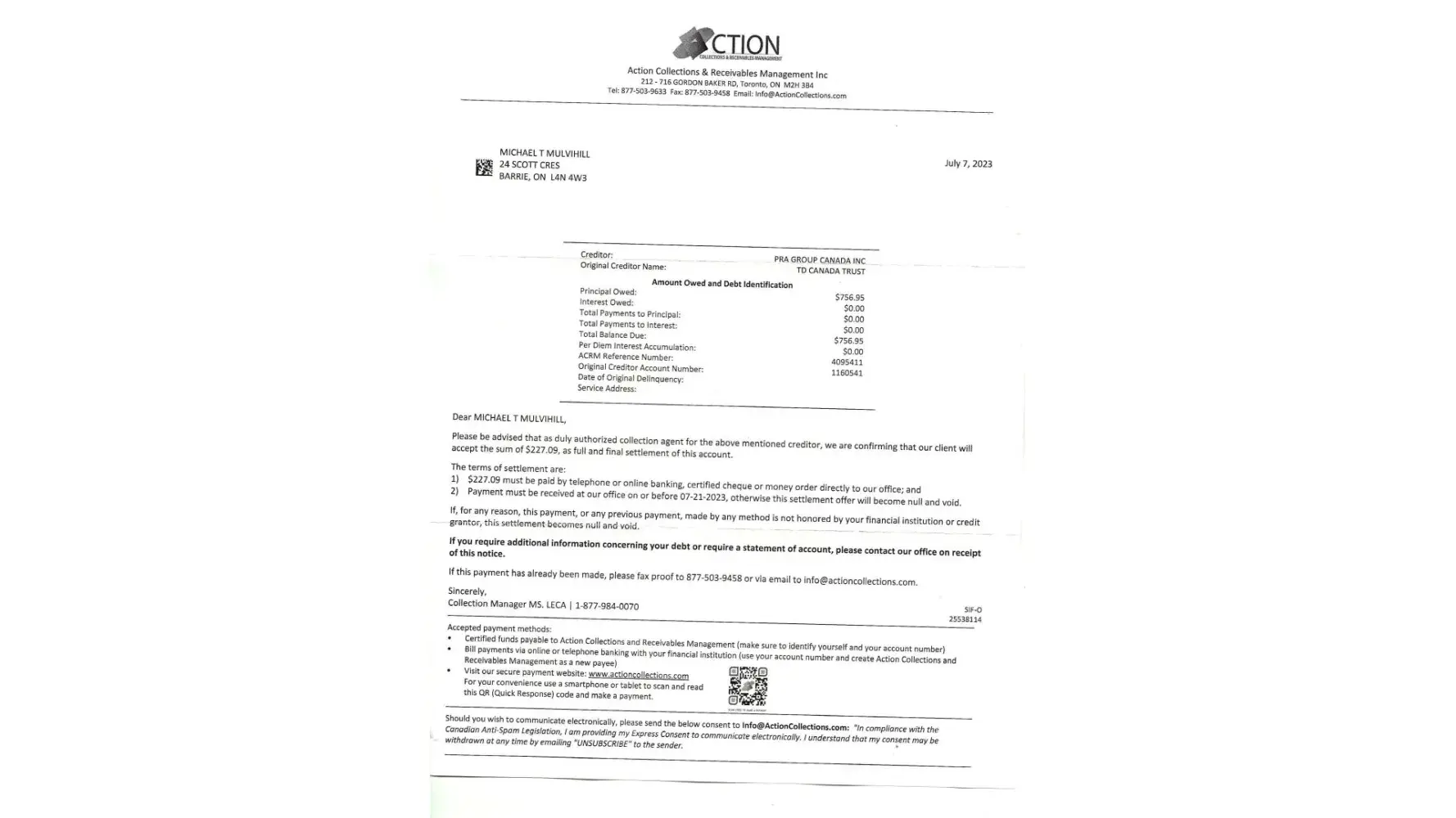 I was contacted by PRA Group Canada Inc. via an *** Letter dated February 10, 2022 in regards to a *** Visa Green Credit Card Debt balance of $2,227.43 with a threat and warning to pay within 10 days of a discounted amounted of $1,336.46 or face the consequences of property ownership confirmation, employment verification, asset determination, examination of Government and private databases and may have a negative impact on my credit rating". Further details included in the letter are as follows: