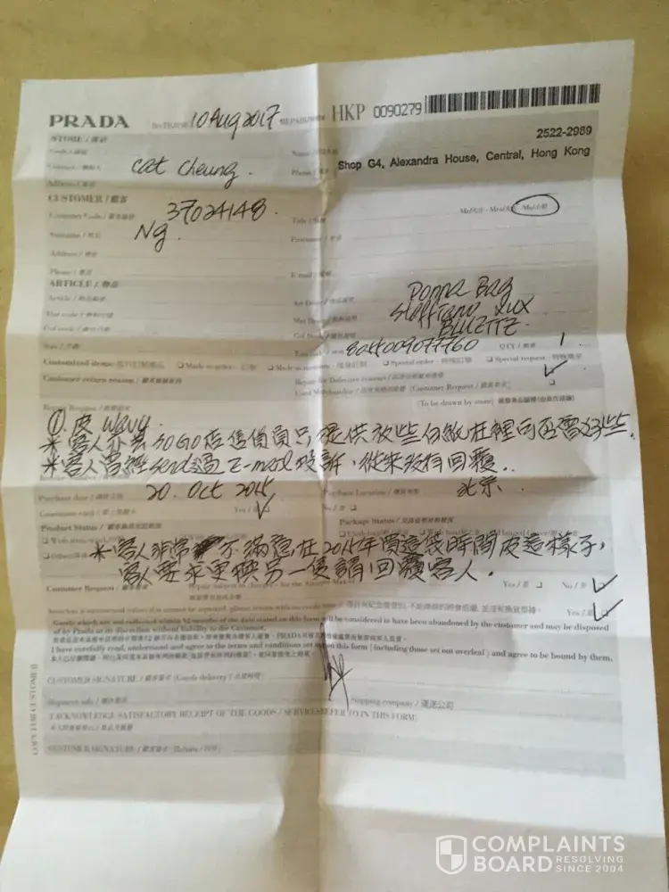 This is my third email trying to find a solution for a bag that I purchased in Hong Kong. I bough a had bag Saffiano Lux, Blue.1BA274, NZVF001600. I made this purchase in Hong Kong the store had to place a order for the bag because it dino't have it on stock, when the bag arrive, your wonderful staff put the bag in a box because it was a gift.