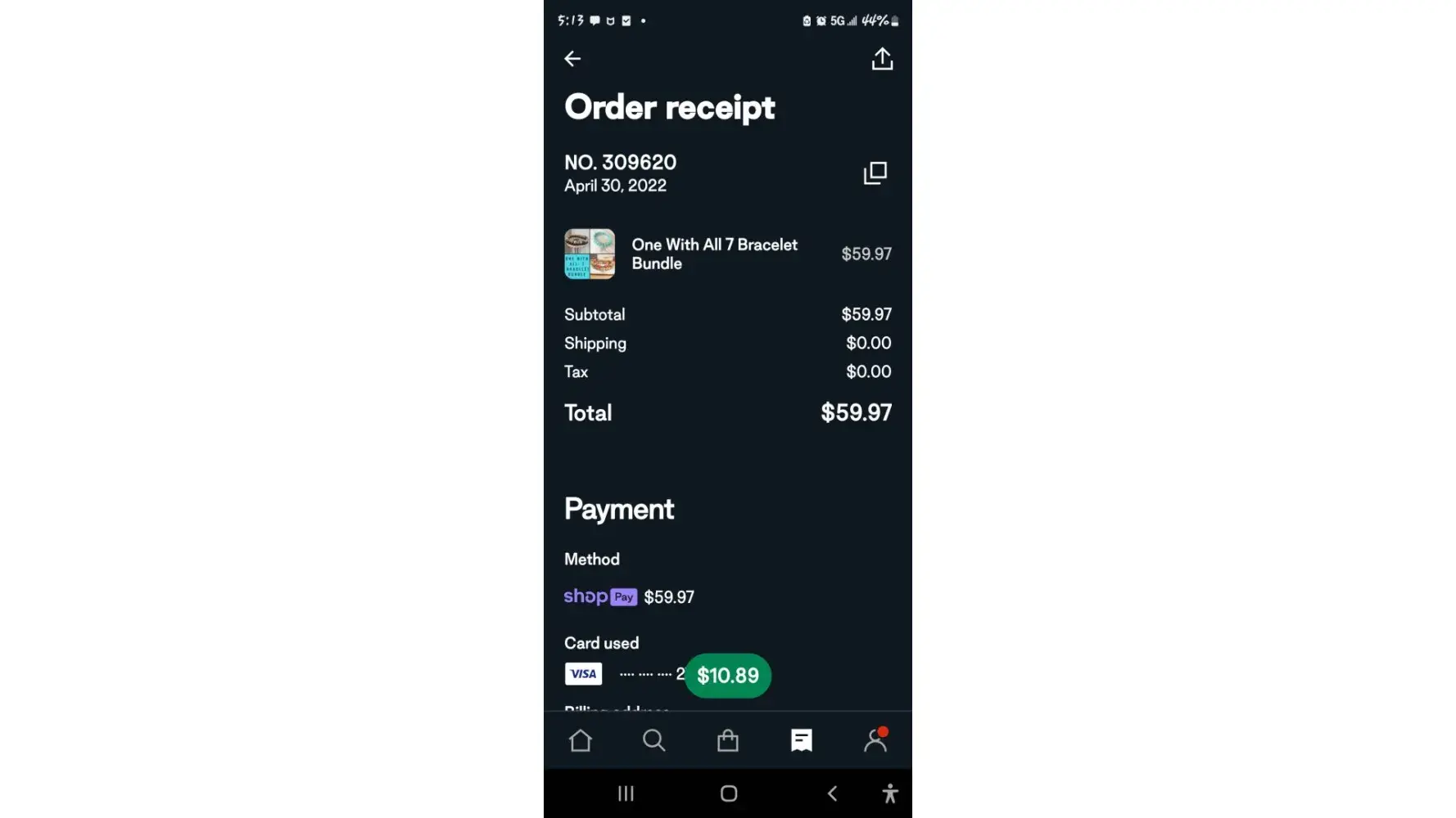 In April 2022, ordered the One With 7 bracelet bundle, for $59.97. Order #309620 status reflects items not shipped yet.