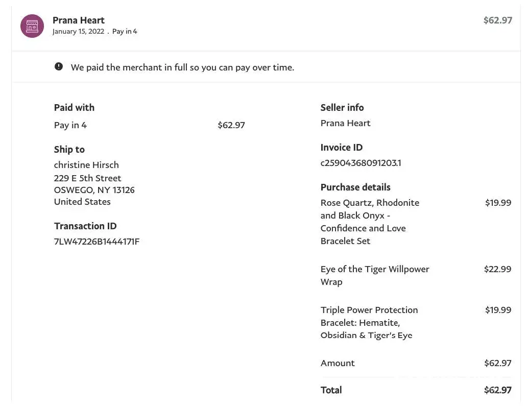 I have purchased jewelry with this company in the past and have had no issues and loved my gifts. What’s up Prana Heart?! Money does not grow on trees! This was going to be a special gift. Very sad.