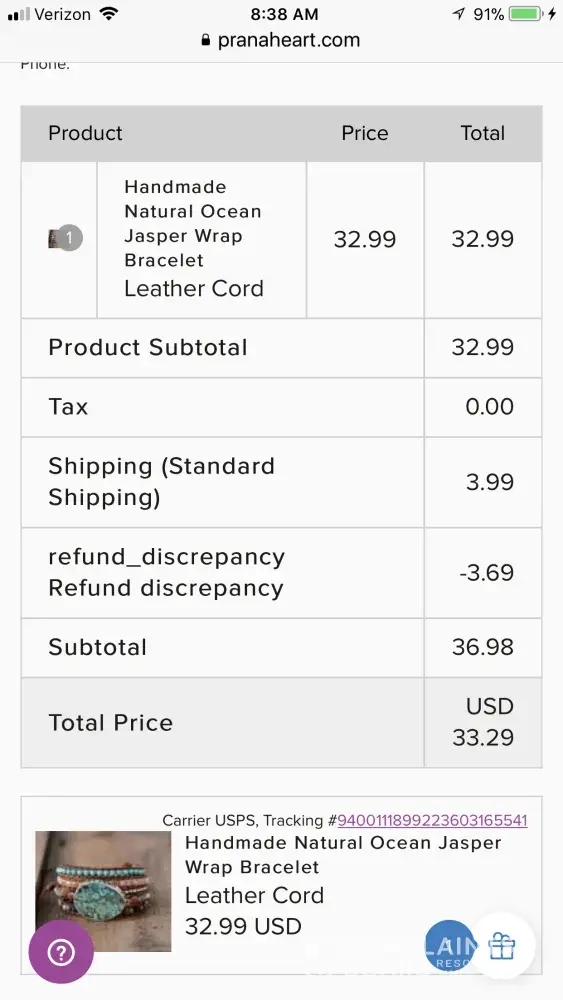 I ordered a Lapis and lava rock Hamsa bracelet from Prana Heart. It was reported delivered by USPS, but apparently was not delivered to my mailbox. It is quite likely that it was delivered to another person who decided to keep it. It has been investigated by Raul, the local postmaster at the Panorama City Post Office, 91402, and he agrees with my deductive reasoning about this "disappeared" item. Finders Keepers and all that. Considering that it was sent via USPS with a tracking number, they have at least $50 in insurance on the item, Prana Heart can afford to give me a replacement.