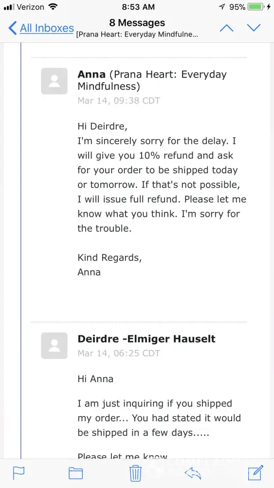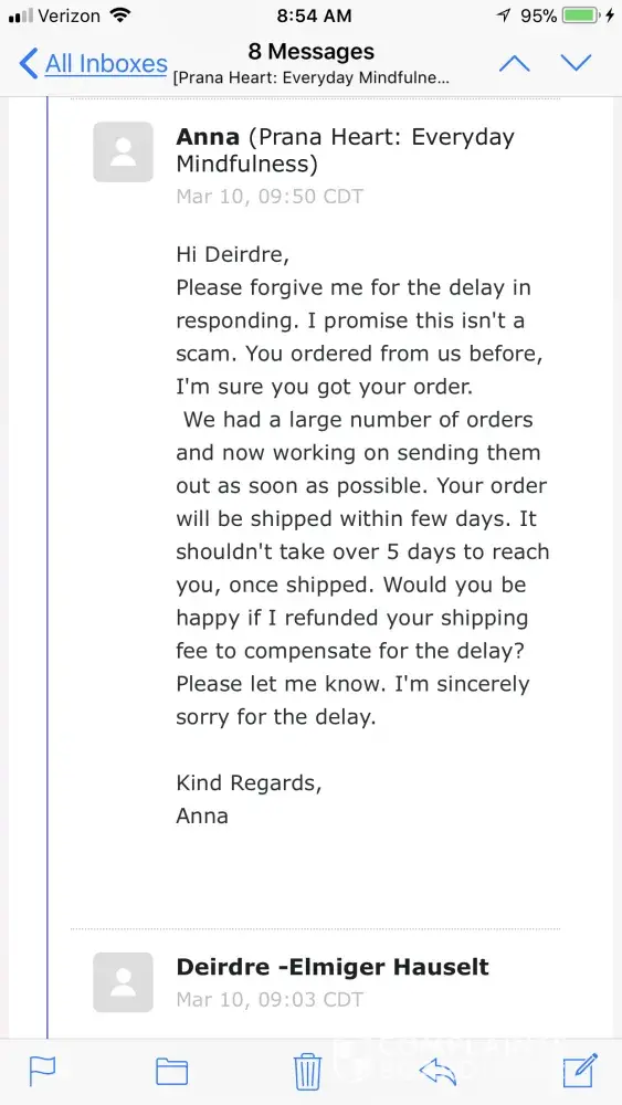 I purchased two bracelets in early February and got an email saying I would get another email to say it was shipped. When I didn't get that I emailed them to see if they sent it, they said they would send it soon, be patient. Then I got an email saying they sent it. Still didn't receive anything and I asked for a refund...then several times I had to ask for a refund, now I have filed a claim with PayPal because the company, three months later, has not refunded my money and is no longer corresponding with me.