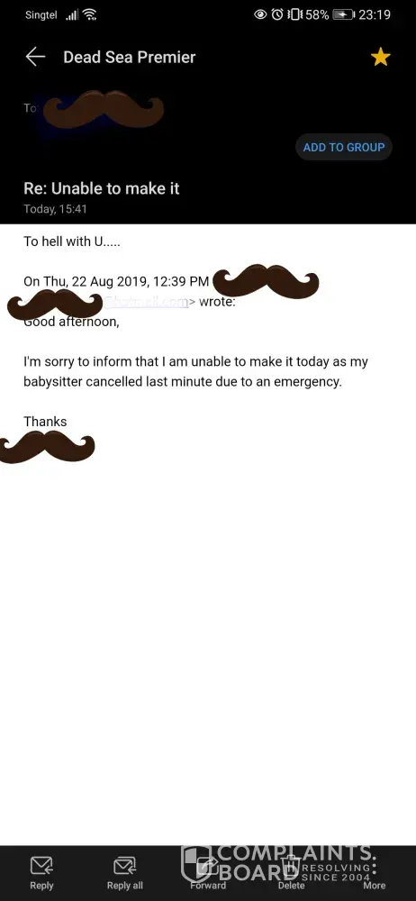 I had a free facial appointment which I was unable to go for since my babysitter had a last minute emergency. I admit I had to cancel and rescheduled twice before but both times I clearly explained why I was unable to attend. I have a couple of young children, one of them being a special child. And I clearly remember that day I emailed deadseapremier, my special child went through a phase where he did not like me using my phone, so instead of calling, I sneaked to compose an email to inform them that I would not be able to make it and apologized. Why couldn't I make it? Because my child was having one of his outburst.
