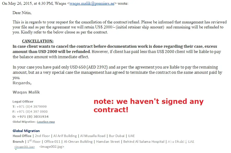This is such a fraud company that i have seen in Dubai, they gave many false promises and register people with a fake contract. I have paid an amount of 2392 aed for migration to Australia and they have not provided me any supprt other than the initial consultation. When i asked for the refund they were saying regarding contract and i need to pay 2000$ to terminate the contract. I have not received any call or email after registration. If anyone can help in refund of the same will be very helpful