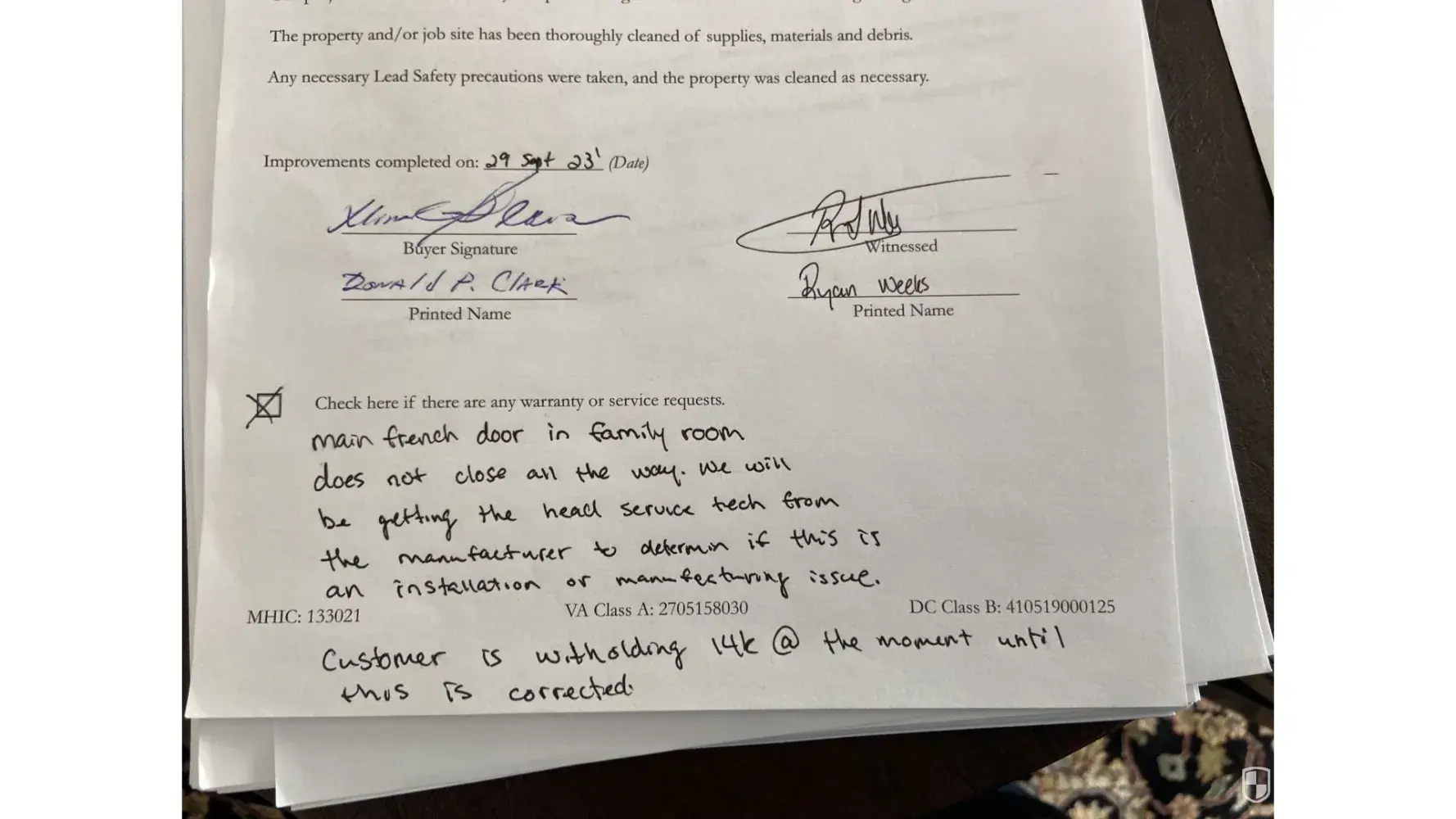 This letter is to document the issues with the installation of the French doors opening to the deck and basement as well as substantial non performance on your behalf in execution of the services provided in the agreement. First upon inspection and partial payment on September 29, 2023 The certificate of Completion I executed along with Ryan Weeks expressly stated the Presidential would have the head service tech from the manufacturer determine whether the issues was installation or manufacturing. This remedy was unilaterally revoked by Presidential and when I asked for the reasons for the change was told I would not be getting a written response other than it was to expensive to bring a representative from Ohio to address the problem. I called to appeal this communication from Christian and asked if I could speak to the CEO and was told that was not possible two line supervisors confirmed they would not honor the written remedy I had accepted.