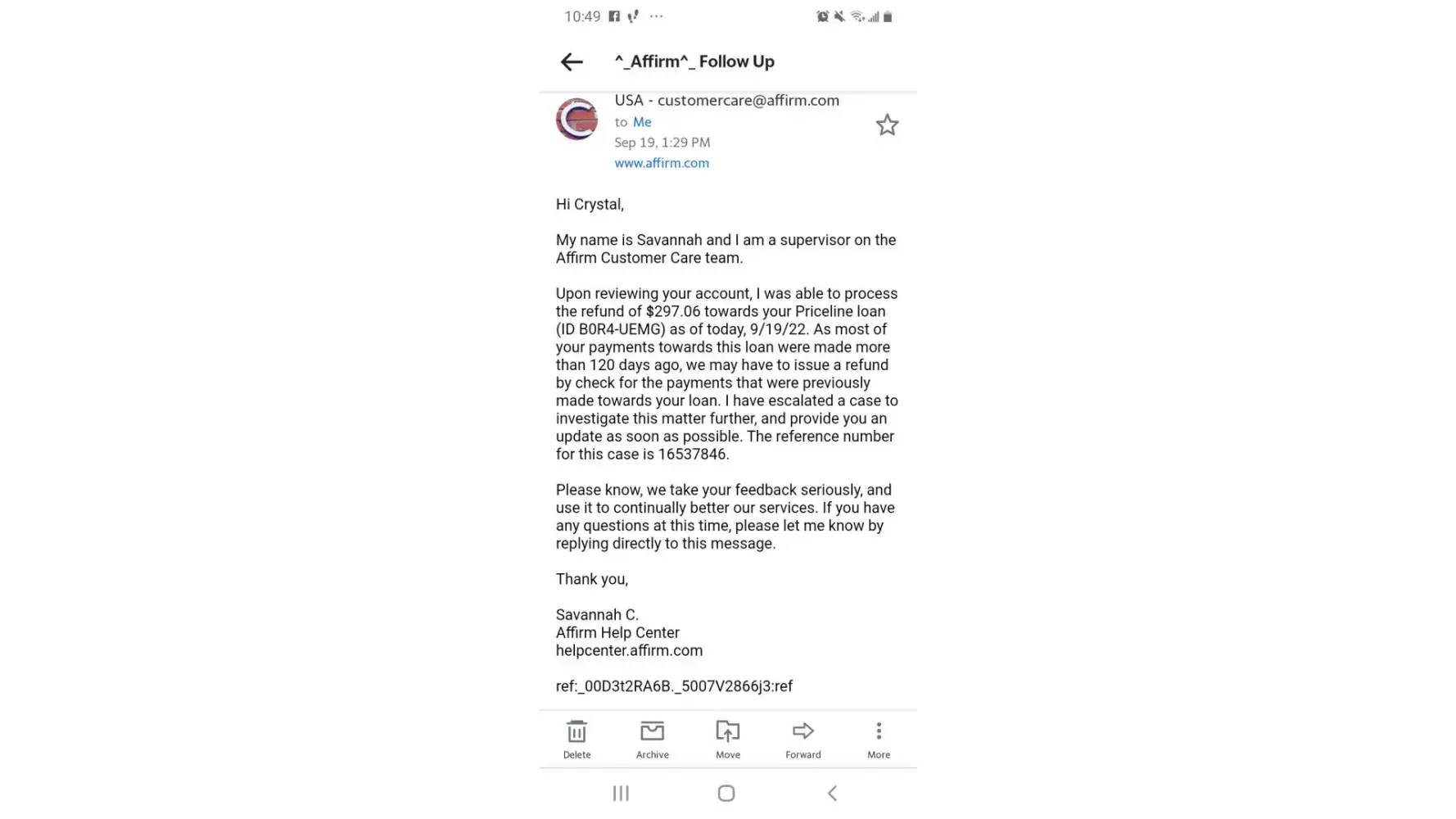 I received a refund from Priceline but have to get it back through a loan company called Affirm. Affirm told me they would send a check by mail but I did not get it. After waiting 3 weeks, I called Affirm and found out the supervisor, who emailed a confirmation response ti me, never completed the refund and the check was not mailed. Now, I was tild I need to wait another 30 days to receive the check. This is u acceptable.