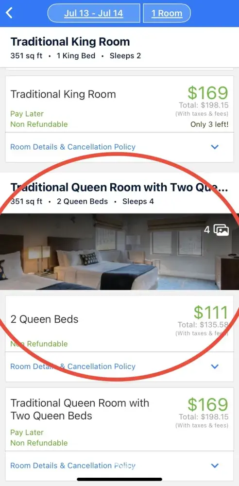 On 07.19.21 I booked two nights at The Portofino Universal in Orlando FL for my daughter and her two small children (5 yrs & 6 mos) The rate was $500/night plus $100/pp for 3 FAST Passes to Universal Park for one day tax, $12/pd valet, resort tax all of which was acceptable.