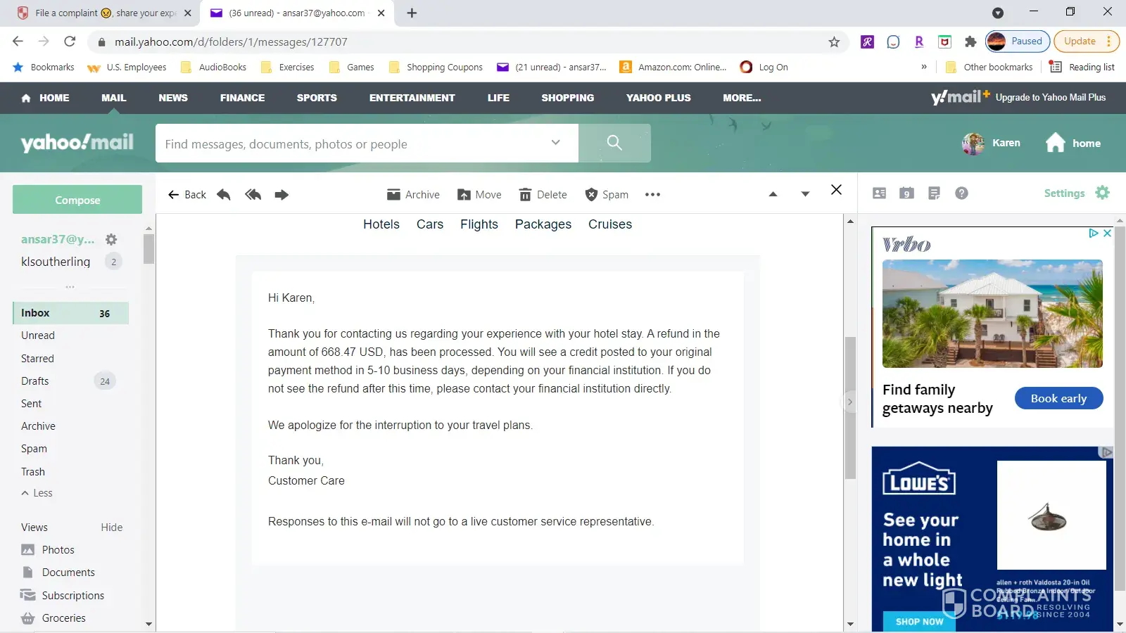 We are still waiting in regards to the response from the hotel in regards to the water damages that we initiated complaints on December 26, 2020.