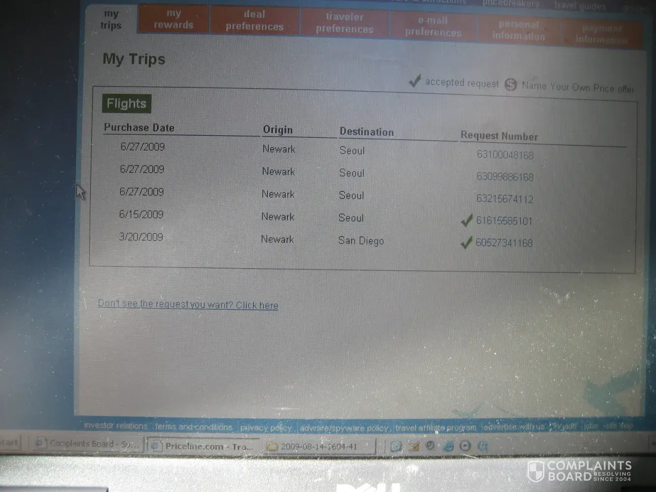 In the past, I had submitted three other Flight Requests through Priceline.com to purchase tickets on-line. They were not accepted, and they were listed as unaccepted (as shown via the "MyTrips" page in the attached photo). As the attached photo shows, there is no showing of Request #[protected]! Also, as the photo indicates, the Requests actually made, on the "same date" as Priceline.com claims, are drastically different. Given the fact that these Request Numbers progress chronologically, Priceline.com's claim that the Request was made on the same day makes absolutely no sense.