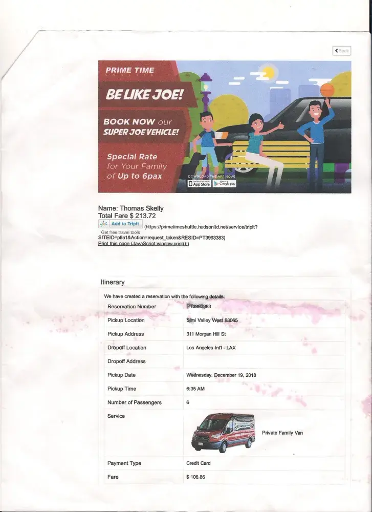 I booked last July 5th for 2 private vans for July 18 pick up. The night before someone called me saying there's no available van to pick us up. This happened last year too. PrimeTime Shuttle should be liable for the stress that you've given us and the amount to get the van.