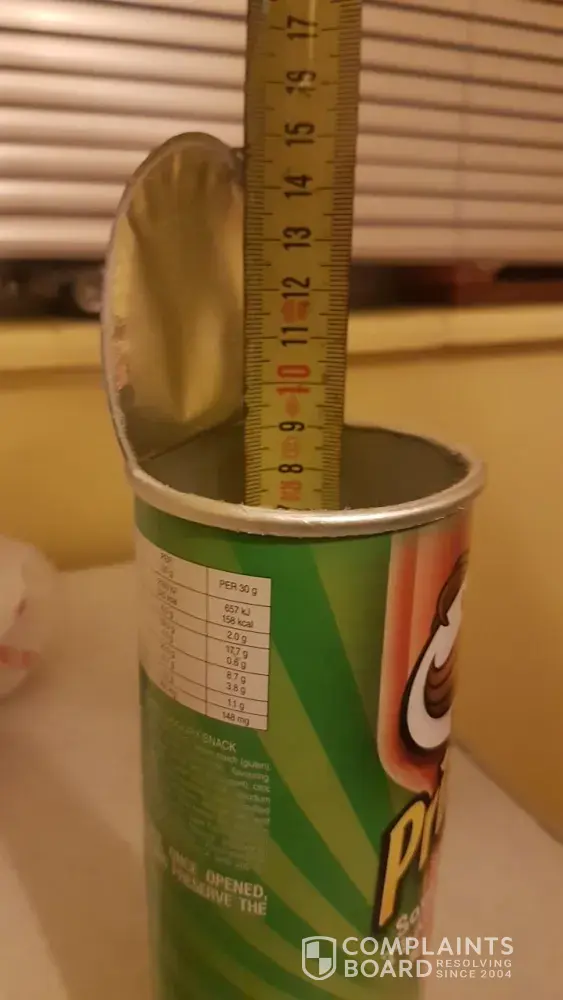 I have just purchased a 110g can of Pringles. I get home so excited to eat them as I've been craving them for a week. I then open it only to get very disappointed to find that I have only got half a can of chips. I would like to be reimbursed for this. There is no way a half can of Pringles can cost R20.00. Not in this economy. I am very disappointed by this.