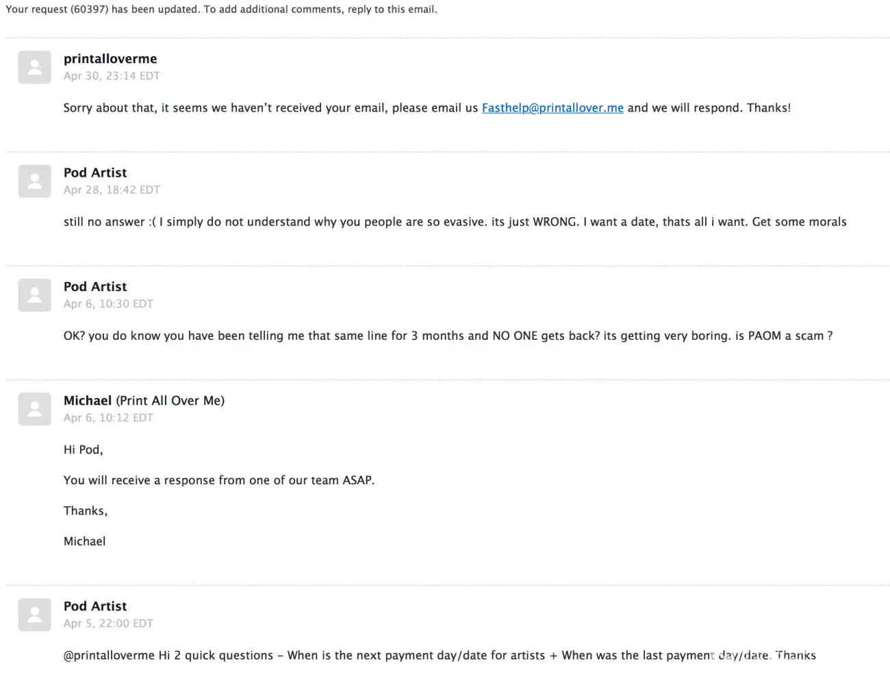 PAOM has yet to compensate me for my sales. The website statistics never showed sales. I was informed of a sale by a customer and friend. The Idea sounds great and I would love to continue supporting the idea of Print all over me, but as I have mentioned, I haven't been compensated for sales or know if I have made any other sales. The email correspondences have proven to go no where so far. The website has revamped itself this year and now require a fee for attempting to sell items with them if you wish to be compensated by them. My profile, a number of designs, as well as custom descriptions of items has all disappeared (even after resigning up to access my designs and assets). If anyone recommends similar services that have proven to be reliable, I am all ears.
