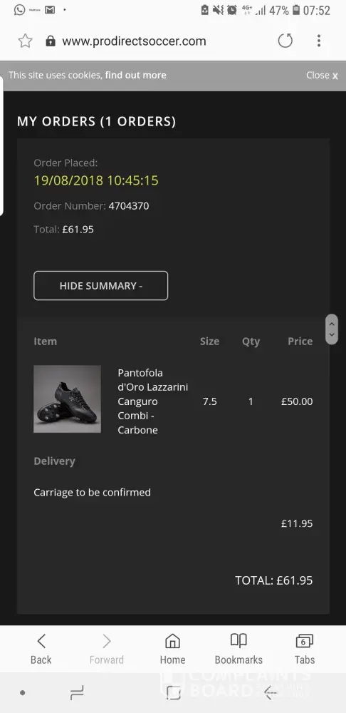 This wld probably be the last time i am sending a message to you guys. I placed an order for a pair of Pantofola soccer boots online on 19 Aug 2018 Sunday and got an email from Pro Direct that the item had been despatched. However, I have not had any response from Pro Direct despite sending several emails and calling your customer service hotline multiple times regarding the whereabouts of my goods. Worst of all, I have not received my goods till date, not even a tracking number. All the website has been showing since 19 Aug was that "Carriage to be confirmed". It was indeed appalling that a big company like yours have such poor or zero response despite your good effort in marketing sports porducts online. It is very costly to call UK from Singapore and I was put on hold for nearly 15min every time I called and no one bothered to pick up the phone. It has never been like this several years ago when I ordered 2 pairs of shoes and it arrived promptly without having to chase PDS for it.