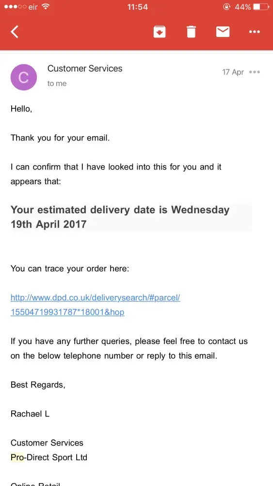 I live in Mumbai, India. I ordered a pair of adidas studs from your site on 14th July. I have received an email asking me to rate the performance of Pro direct. I haven't still received my order. I try to trace the order and it has been showing since the past week that it has been dispatched and that it is in Delhi. I even tried calling the royal mail phone number but a wrong number has been given. Please contact me or email me.