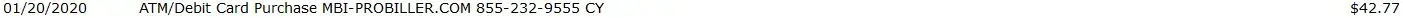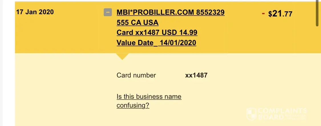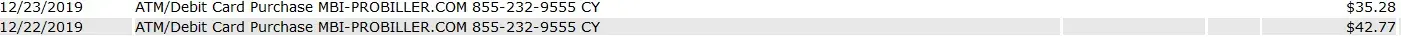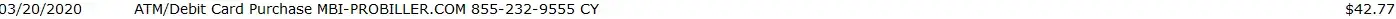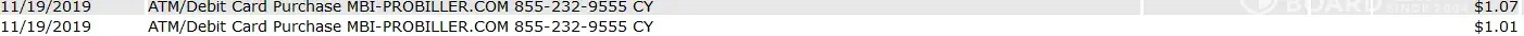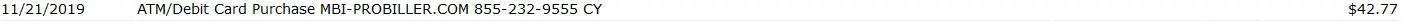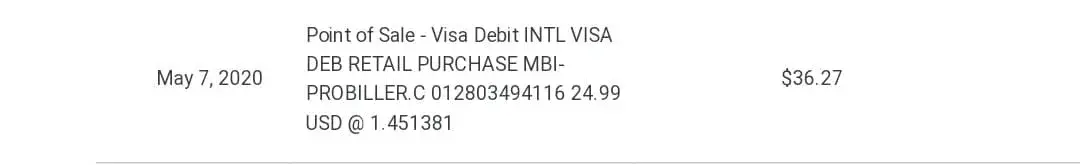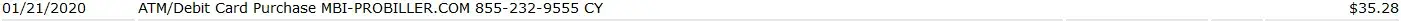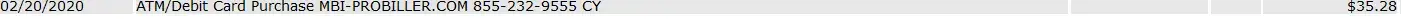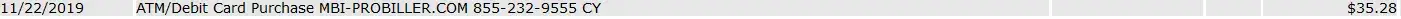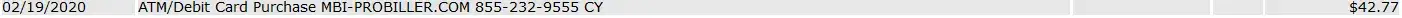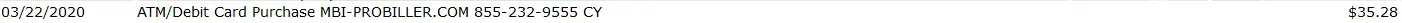 On 3/20/20 Mbi Probiller Com [protected] Caus took 9.99 off of my debit card and honestly I don't remember ever