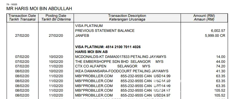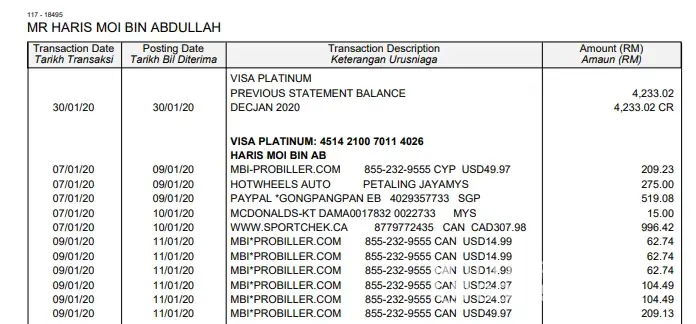 But there were 2 periods of transaction which appeared on my Visa Card statement, showing transactions in USD and RM :
