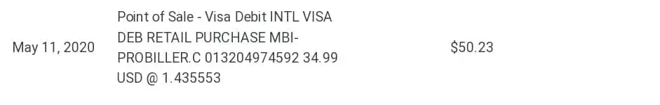 transaction happened on the 14th of May 2020 . Reference number for the transaction is 24034810135000001680560. Title of the charge is 01001295224034810135000001680560 . Location of said charge is from MBI*PROBILLER.COM [protected] USA