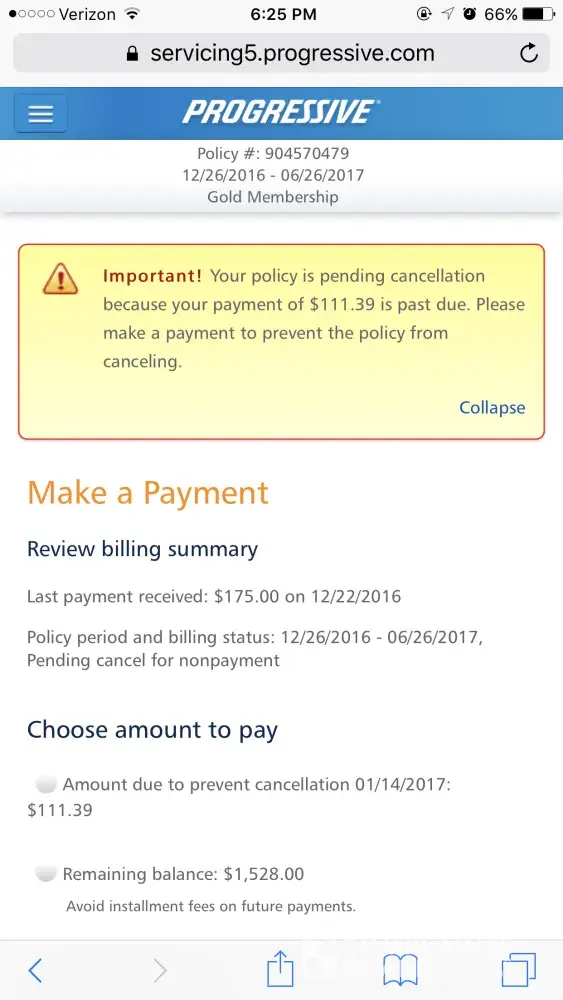 The last two times I have gotten in touch with progressive I have been treated like a complete i####. I called in mid December before my policy renewal to see if I could pay a partial payment of $175. I only knew I could do this because I did it the year before during the holidays. The guy on the phone told me I couldn't and I said, that's interesting considering I had the year before. So he talked to a supervisor, told me they could accept the $175 and told me the rest of the payment would be due with my January payment at the end of January. Today I signed onto my progressive account and it said my policy was going to cancel if they didn't recieve the rest of the money by the 14th. I waited for 15 minutes to be told that they could not combine the two and I needed to make a payment still to avoid cancellation. I am floored. I was told false information and instead of trying to honor it and fix the problem I was treated poorly. I have never had bad experiences with progressive until the last two months. Thank god i check my account regularly to make sure everything is good otherwise I could have continued this month not even realizing my coverage was about to be cancelled.