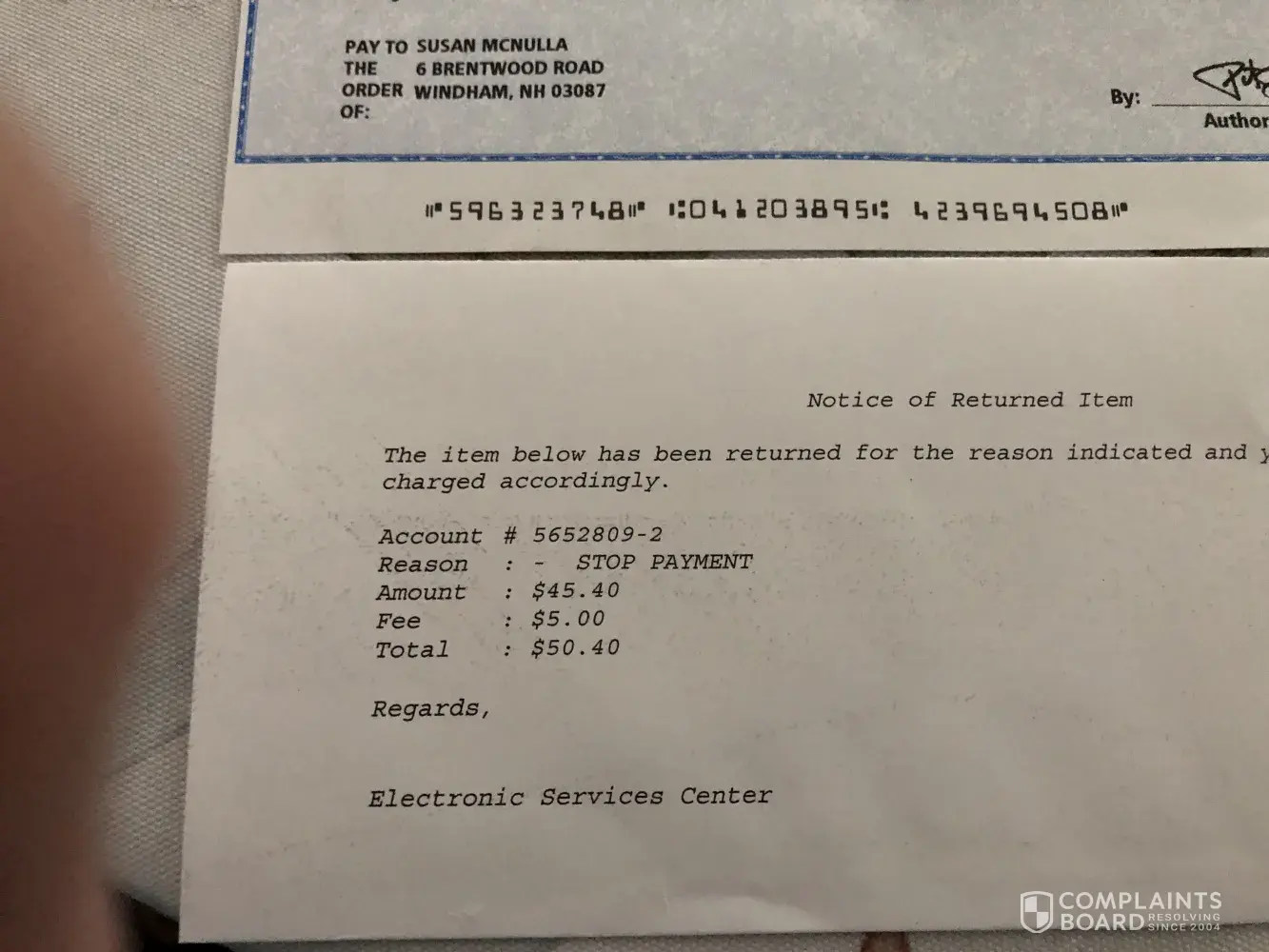 Desired outcome: Refund my$45.40 plus the bank charge of $5.00.