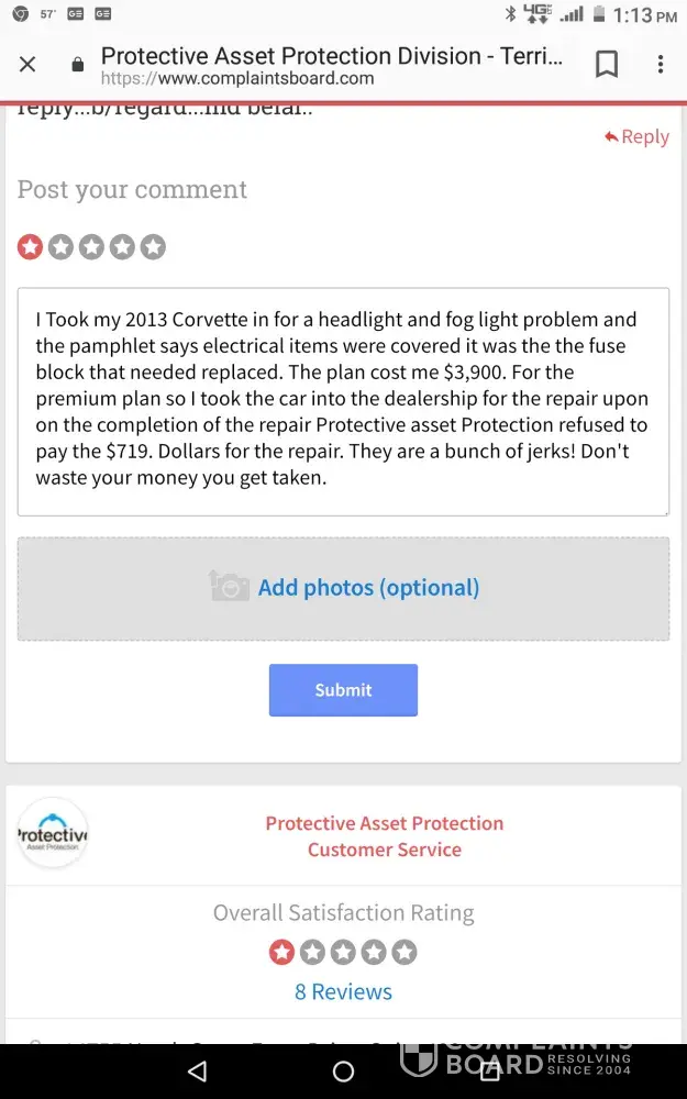I took my 2013 Corvette in for a headlight and fog light problem. Upon completion of the repair Protective asset Protection refused to pay the $719. Repair bill