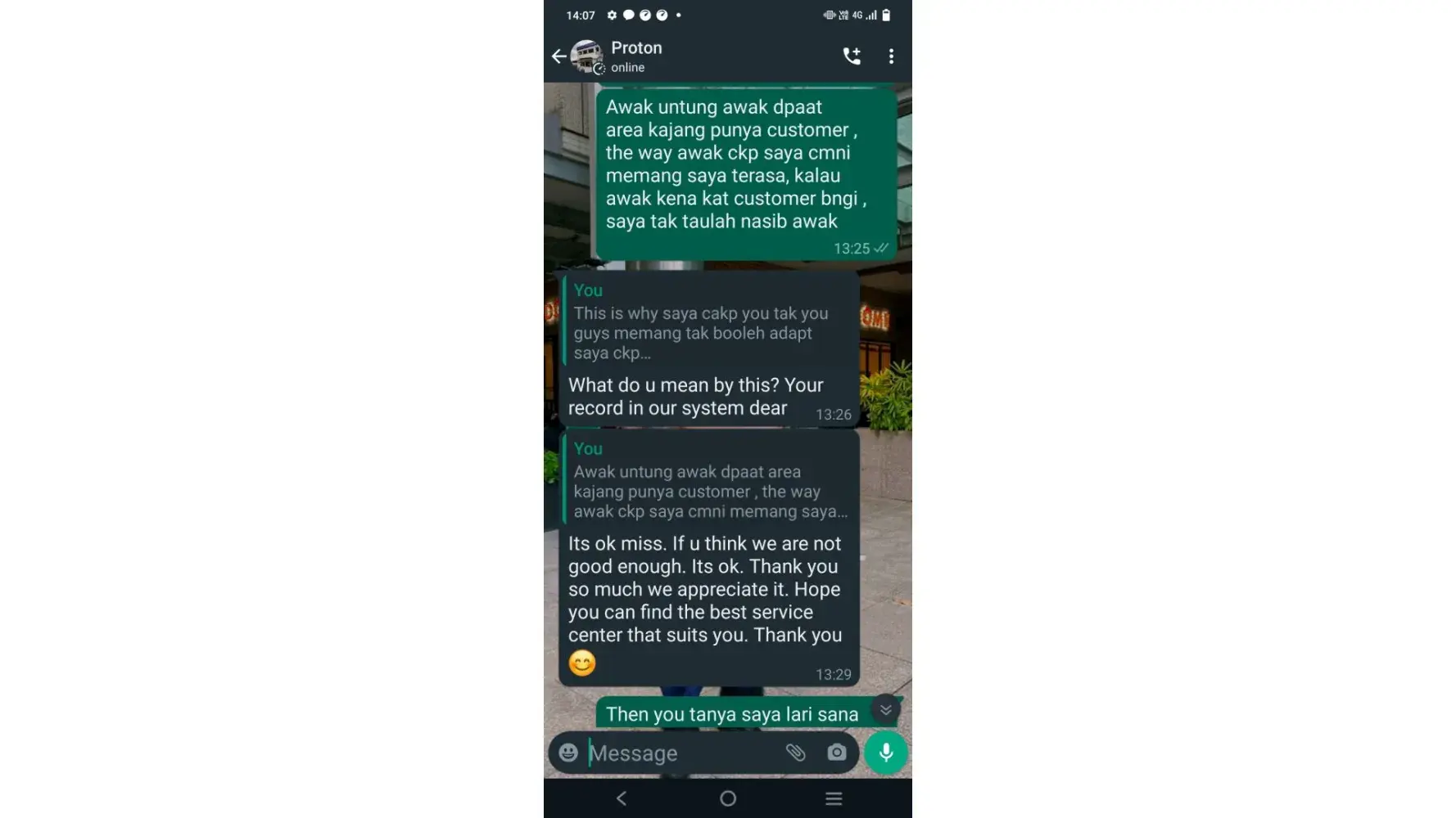 Saya telah membuat aduan di Proton Jenaris berkenaan dengan issue ini Tapi mereka mengatakan bahawa saya sering lari ke sana sini bertukar service. Saya juga ingin memaklumkan bahawa ada juga silap saya tidak kekal kepada satu service center sahaja,ini kerana waktu berkerja saya berubah tempat. Saya juga berharap yang Proton Jenaris dapat membantu saya instead bergaduh dengan saya. Sebagai pengguna proton, perkara ini tidak wajar berlaku dan tidak professional cara percakapan mereka dengan saya.